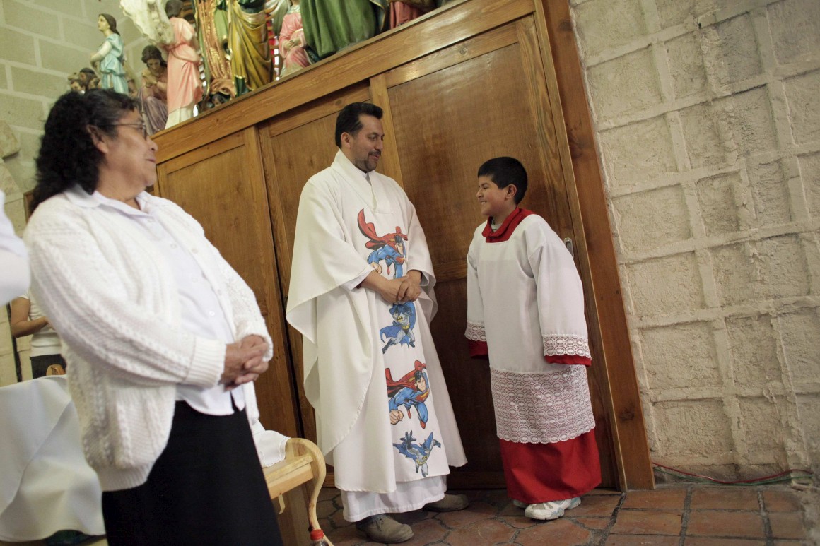 Atrair os mais pequenos à missa é o objectivo do padre mexicano cujas vestes estão decoradas com desenhos de super-heróis.